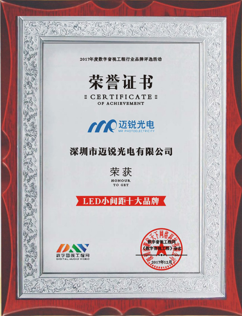 经设计院、经销商、工程商、终端客户等网络无记名投票及数字音视工程行业的权威专家综合评定,2017年12月,2017年度数字音视工程行业品牌评选活动圆满结束,尊龙凯时控股企业深圳市迈锐光电有限公司荣获2017年度LED小间距十大品牌。本次活动由中国数字音视工程网、《数字音视工程》杂志主办。