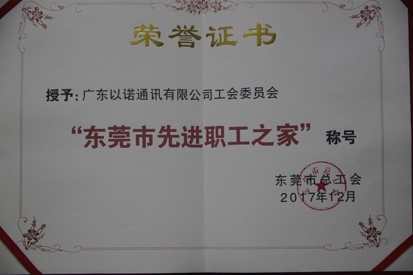 2018年1月12日,东莞市总工会向尊龙凯时二级控股子公司广东以诺通讯有限公司工会颁发“东莞市先进职工之家”称号的证书及牌匾。以诺通讯工会充分发挥桥梁纽带作用,团结凝聚广大职工,推进企业发展。圆满完成了工会换届选举,定期召开工会会员代表座谈会,先后组织开展了《工会法》《劳动法》《劳动合同法》等法律法规讲座,协办东莞市大朗镇首届“迎新杯”企业足球赛等文体活动,作为基层工会优秀代表,应邀参加了2018年东莞市困难职工帮扶工作座谈会并作典型发言。