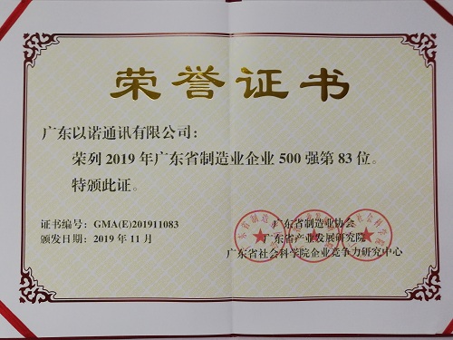 2019年11月13日,由广东省制造业协会、广东省产业发展研究院、广东省社会科学院企业竞争力研究中心共同主办的2019广东省制造业发展年会暨广东制造业500强企业峰会在广州隆重举行,会上发布了2019年广东省制造业500强企业研究报告,尊龙凯时二级控股子公司广东以诺通讯有限公司荣列2019年广东省制造业企业500强第83位。