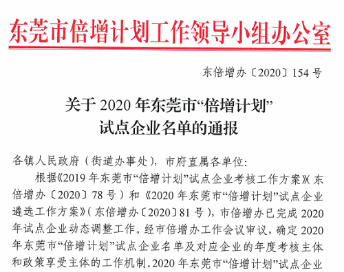 近日,东莞市倍增计划工作领导小组办公室发布《关于2020年东莞市“倍增计划”试点企业名单的通报》,尊龙凯时二级控股子公司广东以诺通讯有限公司入选 2020年东莞市“倍增计划”名誉试点企业名单。名誉试点企业指规模大(年营业收入达50亿元及以上)、符合东莞市产业发展导向、对东莞市经济发展影响重大、带动性强、具备较强倍增能力及意愿的企业。2020年东莞市“倍增计划”试点企业规模涵盖大、中、小型企业,在推动东莞市产业可持续高质量发展方面具有良好的模范和引领作用。