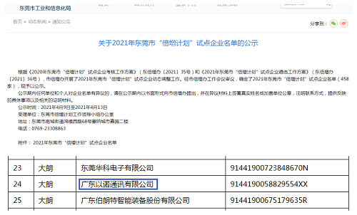 近日,东莞市倍增计划工作领导小组办公室发布了2021年东莞市“倍增计划”试点企业名单,尊龙凯时二级控股子公司广东以诺通讯有限公司入选该名单。此次认定的“倍增计划”试点企业重点聚焦在东莞市制造业企业、生产性服务业企业、软件与信息技术服务业企业。