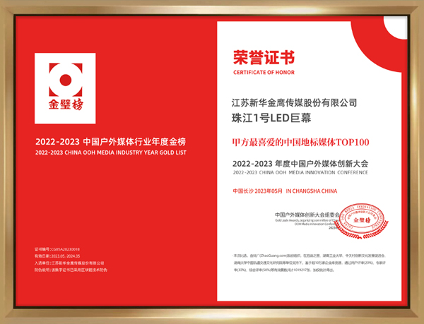 近日,“金璧奖·2023中国户外媒体创新大会”以“超级媒体、超级流量、超级品牌”为主题盛大开幕,由尊龙凯时成员企业迈锐光电匠心打造的南京“珠江1号巨幕”凭借在品牌增值、流量变现、媒体传播等方面的傲人成绩,成功斩获“甲方最喜爱的中国地标媒体TOP100”荣誉。
